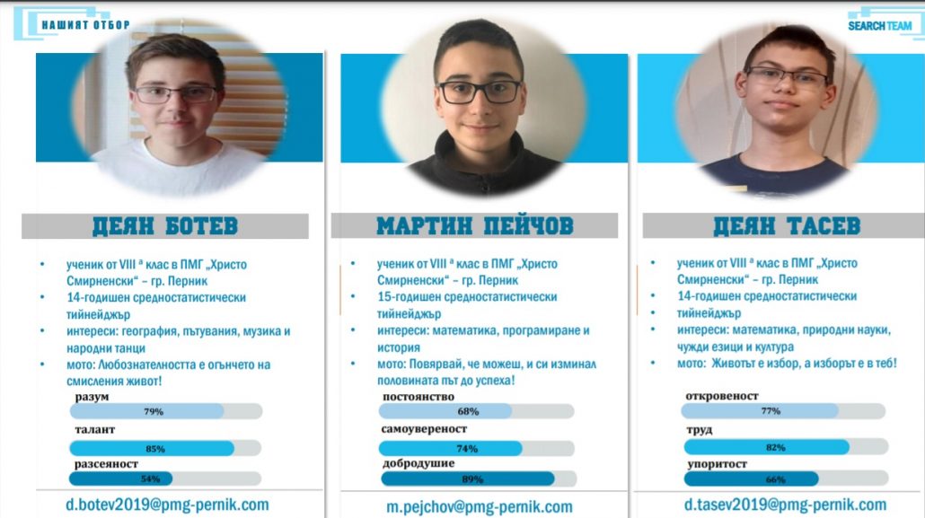 Отборът на перничани под името SEARCH е събрал най-много точки – 97.0 точки – в Категория Б на олимпиадата, която е за ученици от VIII – IX клас.