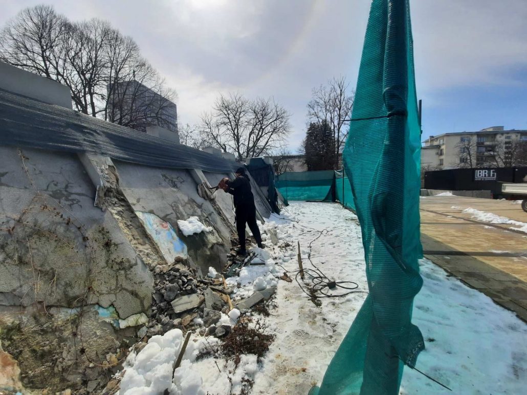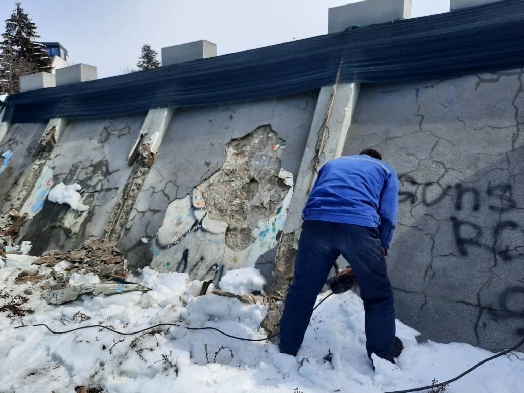 Започна ремонт на Мемориала в Перник. Работници вече откъртват мазилката по фасадата, на която отново ще бъдат поставени черни мраморни плочи – така както беше преди да бъде разграбен от вандали.