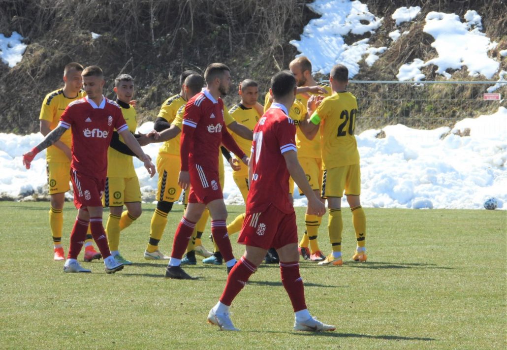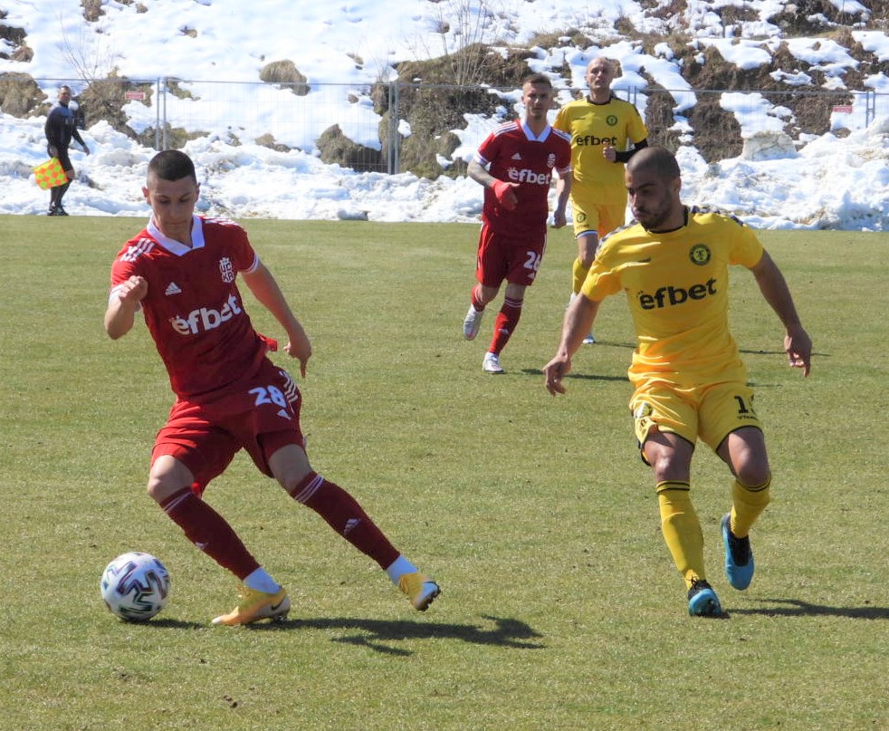 „Червените“ притиснаха съперника си в следващите минути, но вратата на „чуковете“ не бе застрашена. Възпитаниците на Росен Кирилов опитваше с флангови атаки да преодолее защитата на перничани, но „жълто-черните“ стояха добре подредени в собствената си половина.