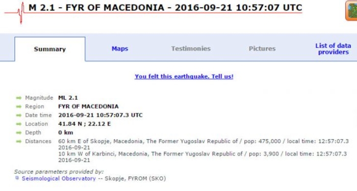 Земетресение с магнитуд 2.1 по скалата на Рихтер следобед отново разтресе Македония.Според данни земетресението е регистрирано в района на Карбинци в 12:57 часа.