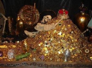 Според непотвърдени данни там са заровени петдесет съндъка със златни свещници и украса за олтар, в която има вградени шестстотин големи топаза, двеста огромни смарагда и диаманта, а също така и 9000 златни монети, пише съновник.бг.