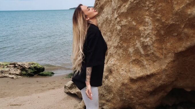 Сузанита се нащрака, вперила поглед в огромна жълто-червена скала. Младата певица е зинала, сякаш й прави серенада. Къде обаче се намира скалата, надвиснала над плаж със светъл ситен пясък, остава тайна.