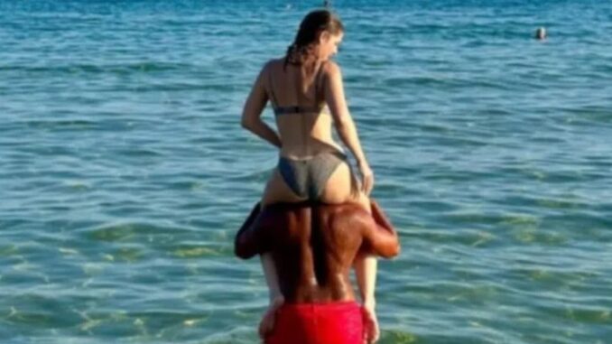 Алекс Сърчаджиева взриви социалните мрежи с горещ кадър от морето – по бански, седнала на раменете на стегнат, потънал в тен тъмнокож мъж, с широка усмивка и без капка притеснение.