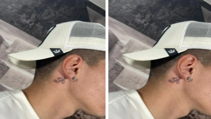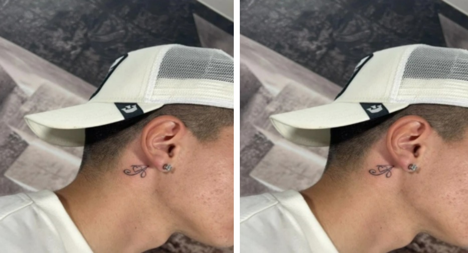 Още тук се вижда „А“-то, което е татуирано на врата му под ухото. Към буквата има и малко сърце, а от друга снимка става ясно, че е адресирано към Алисия, защото кадърът го показва той като малък с известната си майка.