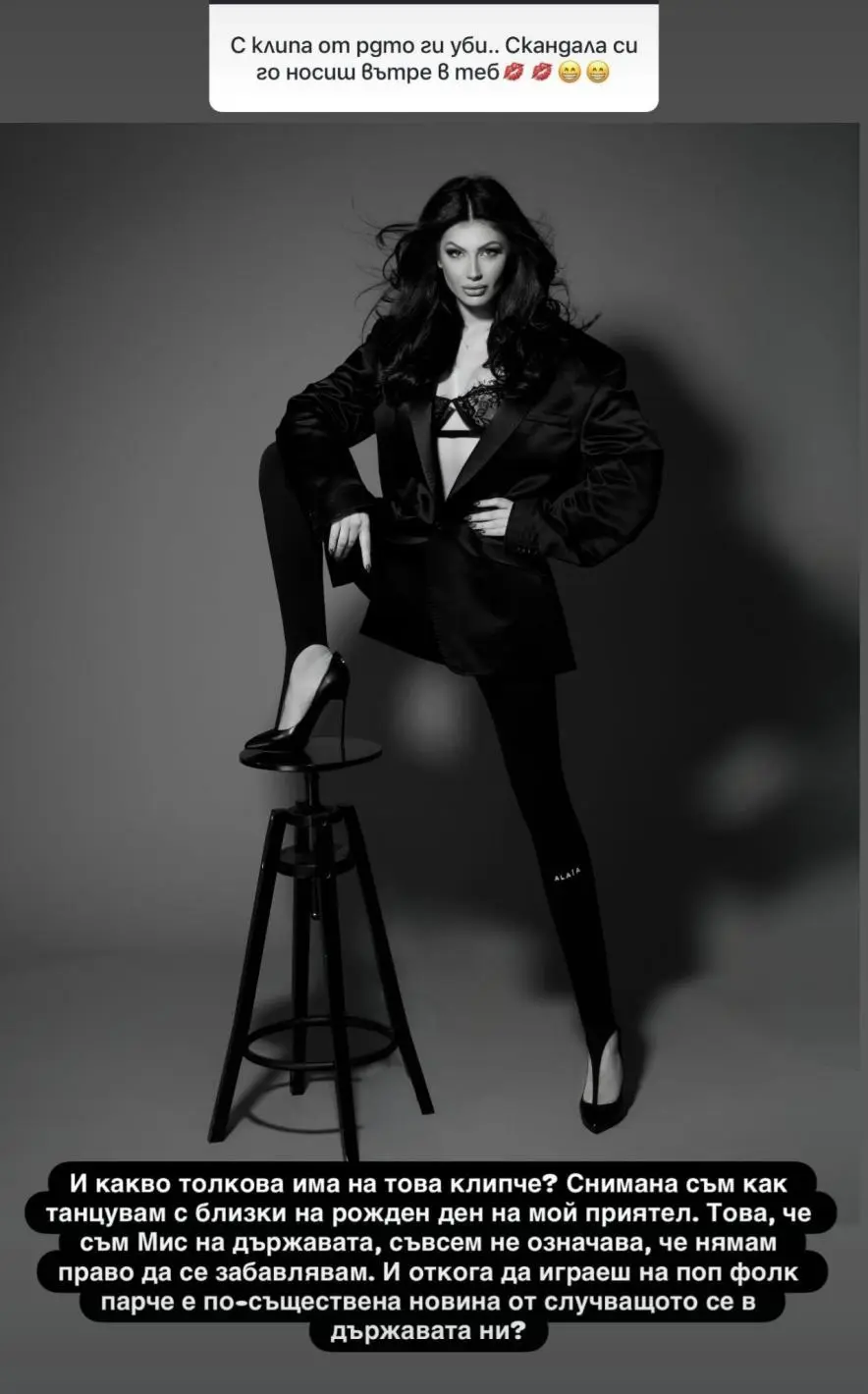 „И какво толкова има на това клипче? Снимана съм как танцувам с близки на рожден ден на приятел. Това, че съм Мис на държавата, съвсем не означава, че нямам право да се забавлявам. И откога да играеш на поп фолк парче е по-съществена новина от случващото се в държавата ни?“, изригна моделката.