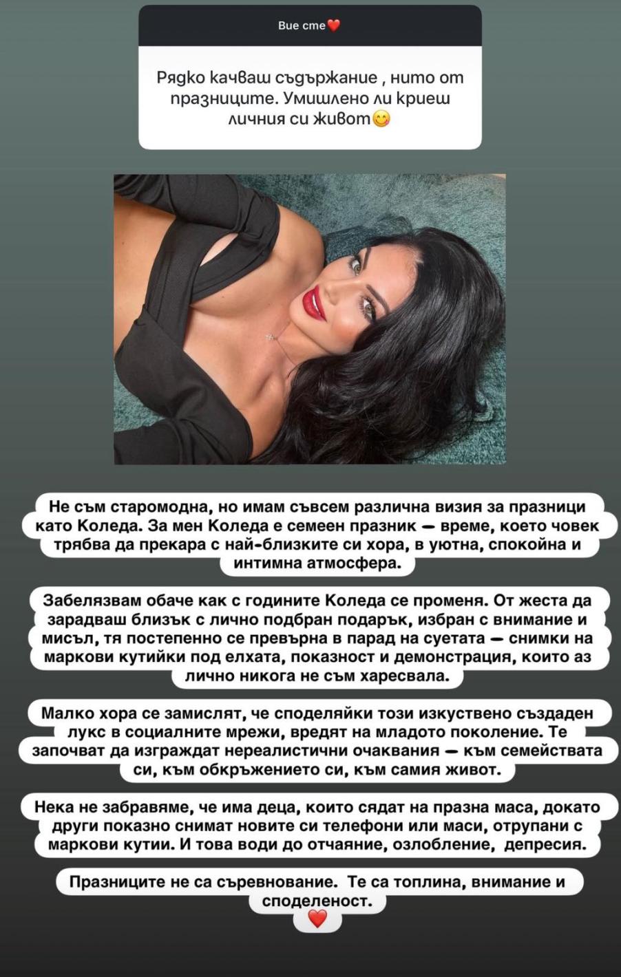„Не съм старомодна, но имам съвсем различна визия за празници като Коледа. За мен Коледа е семеен празник — време, което човек трябва да прекара с най-близките си хора, в уютна, спокойна и интимна атмосфера.