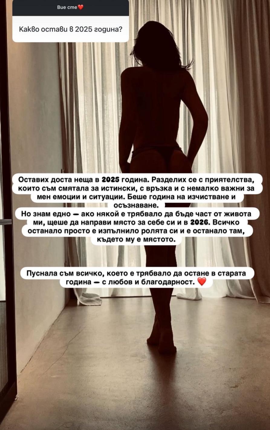„Оставих доста неща в 2025 година. Разделих се с приятелства, които съм смятала за истински, с връзка и с немалко важни за мен емоции и ситуации. Но знам едно – ако някой е трябвало да бъде част от живота ми, щеше да направи място за себе си и в 2026. Всичко останало просто е изпълнило ролята си и е останало там, където му е мястото.“