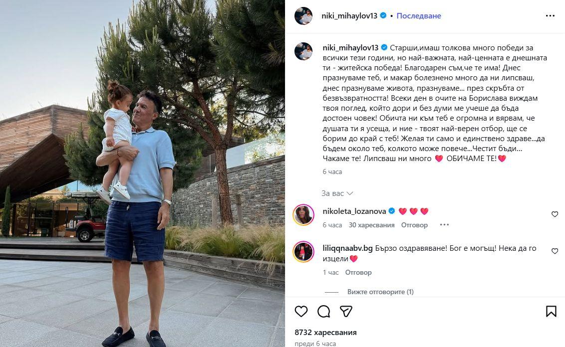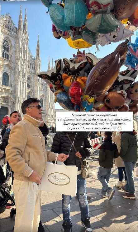 Своята подкрепа изрази и Николета Лозанова, половинката на Николай. Тя сподели символичен кадър от Милано, на който Борислав Михайлов избира балон пред катедралата. Балонът – за внучката. А думите ѝ са кратки, но ясни: „Ти правиш всичко, за да я виждаш щастлива. Днес празнуваме теб, най-добрия дядо. Бори се. Чакаме те у дома“, написа Лозанова.
