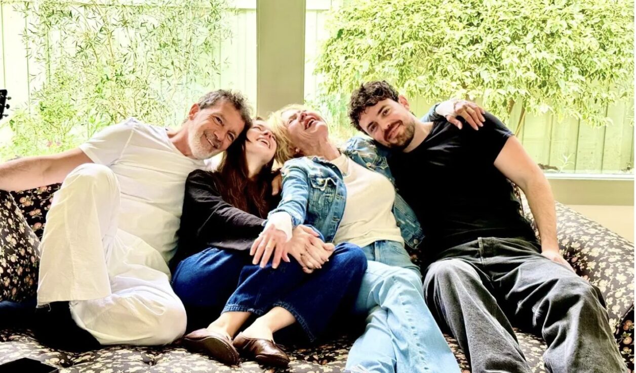 Бандерас сподели по-интимна снимка със семейството си в Instagram в понеделник, публикувайки снимка на себе си, Грифит, Стела и Грушински, на която откровено се смеят на дивана.