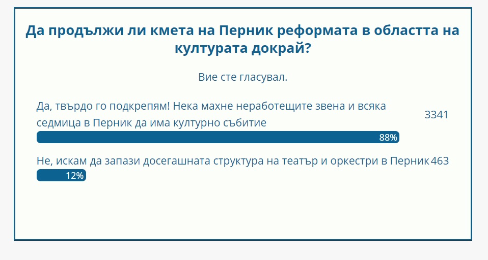 88% твърдо подкрепят кмета да продължи реформата в културата на Перник докрай. Те искат от него да закрие неработещите звена и всяка седмица в Перник да има културно събитие.