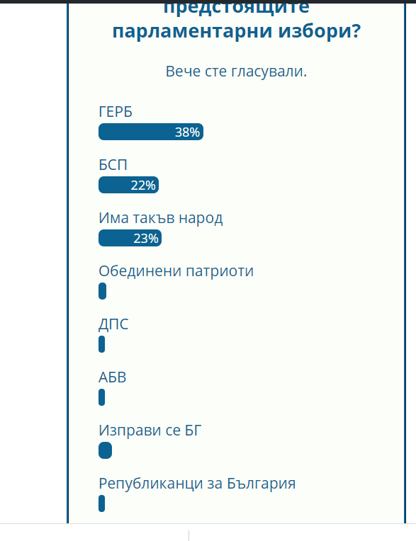 Не гледайте точните проценти. Това все пак е анкета, а не реален вот в урната. Анкетата показва тенденции, а не резултати. Тенденцията, според гласовете на хората в анкетата може да се обобщи в:
