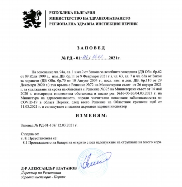 Изменението касае заповедтта от 12-ти март, в точка 8 и е подписана от директоран на РЗИ Перник Александър Златанов.