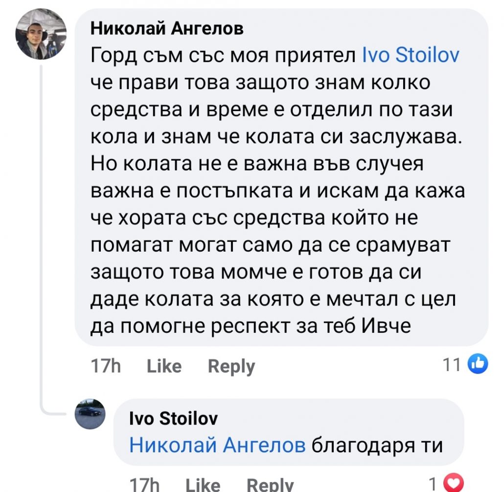 Въпреки, че не изпада в емоционални подробности, от негов приятел разбираме, че жестът, който прави Иво му коства много, тъй като е мечтал за такава кола.