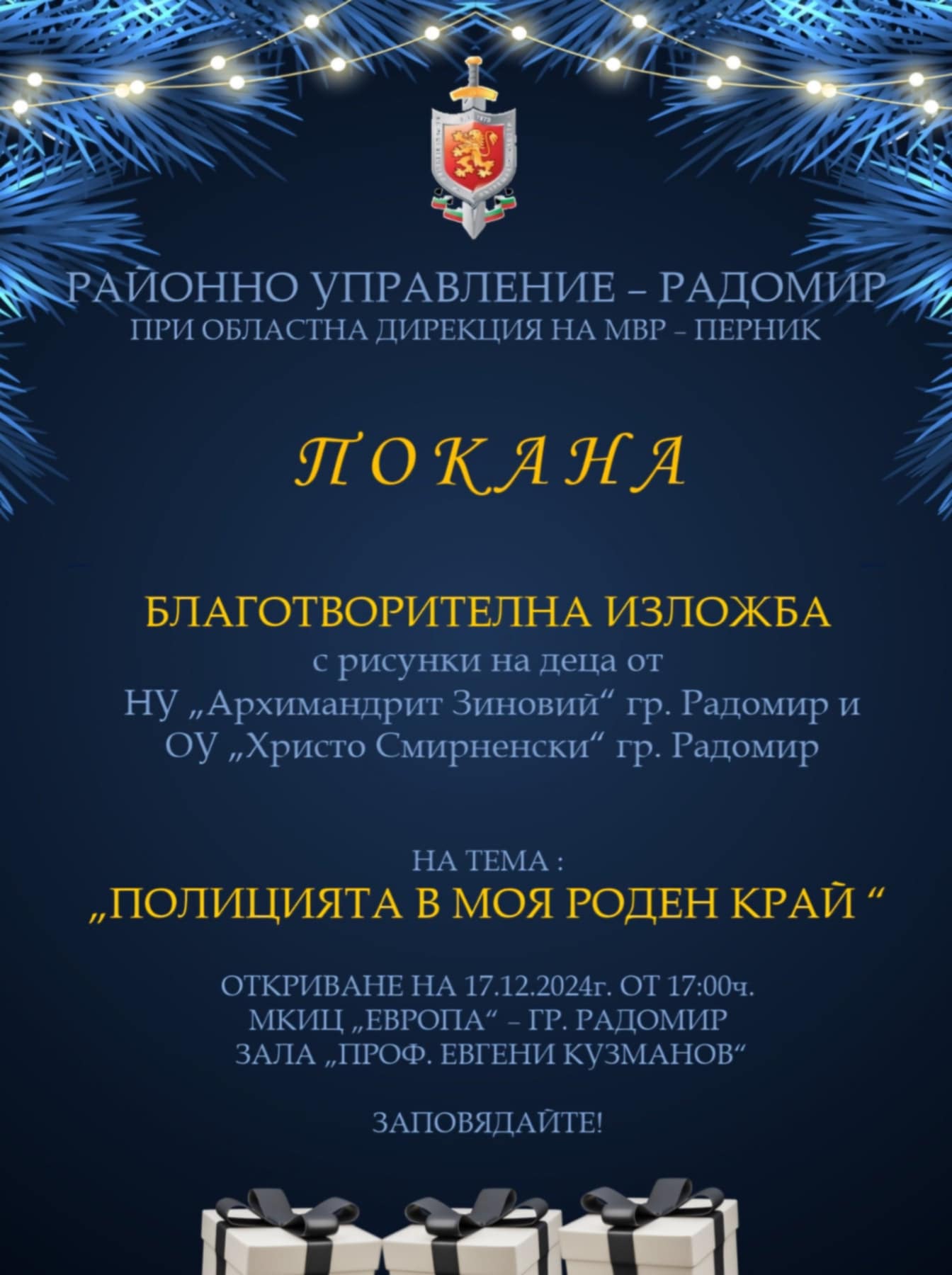 Откриването е утре, 17 декември 2024 г., от 17, 00 ч., в Младежкия културно-информационен център „Европа“ гр. Радомир. Организаторите канят обществеността и медиите, на благотворителната инициатива.