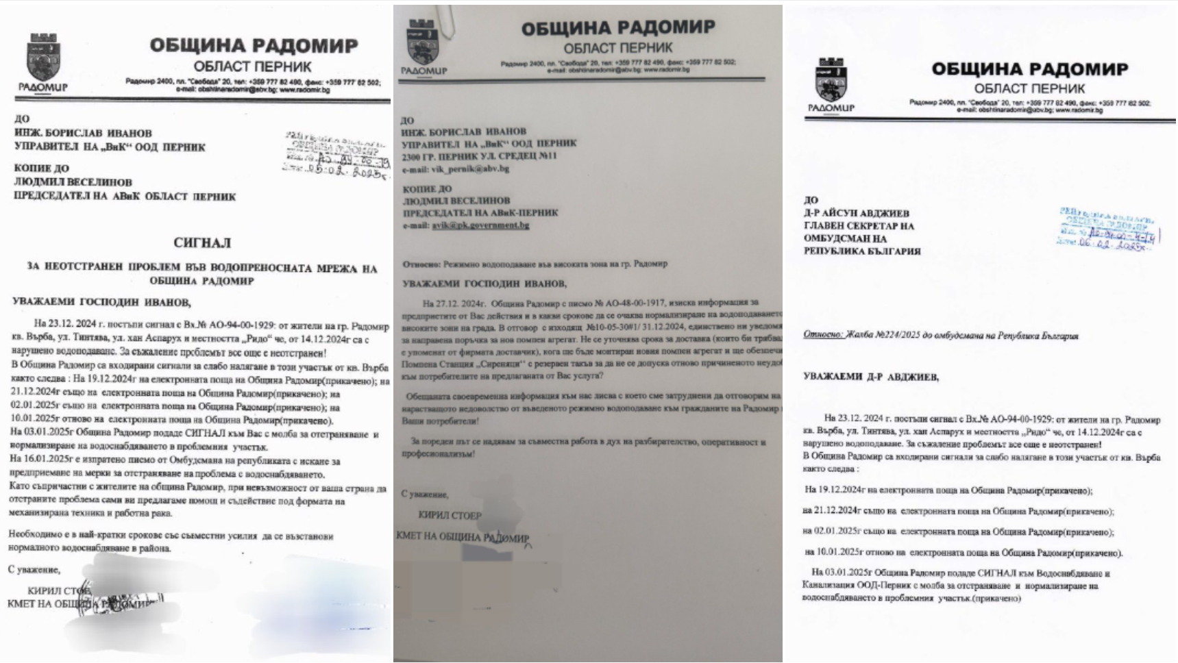 На 5 февруари отново изпратих сигнал за неотстранен проблем във водопреносната мрежа на местността “Ридо” в квартал Върба, сигналът е адресиран до управителя на ВиК – Перник и до областния управител в качеството му на председател на Асоциация ВиК. Сигналът касае проблема с водоподаването в кв. Върба от 14 декември 2024г. На 6 февруари във връзка с жалба №224/2025 с писмо до Омбудсмана го информирам, че проблемът все още не е отстранен.