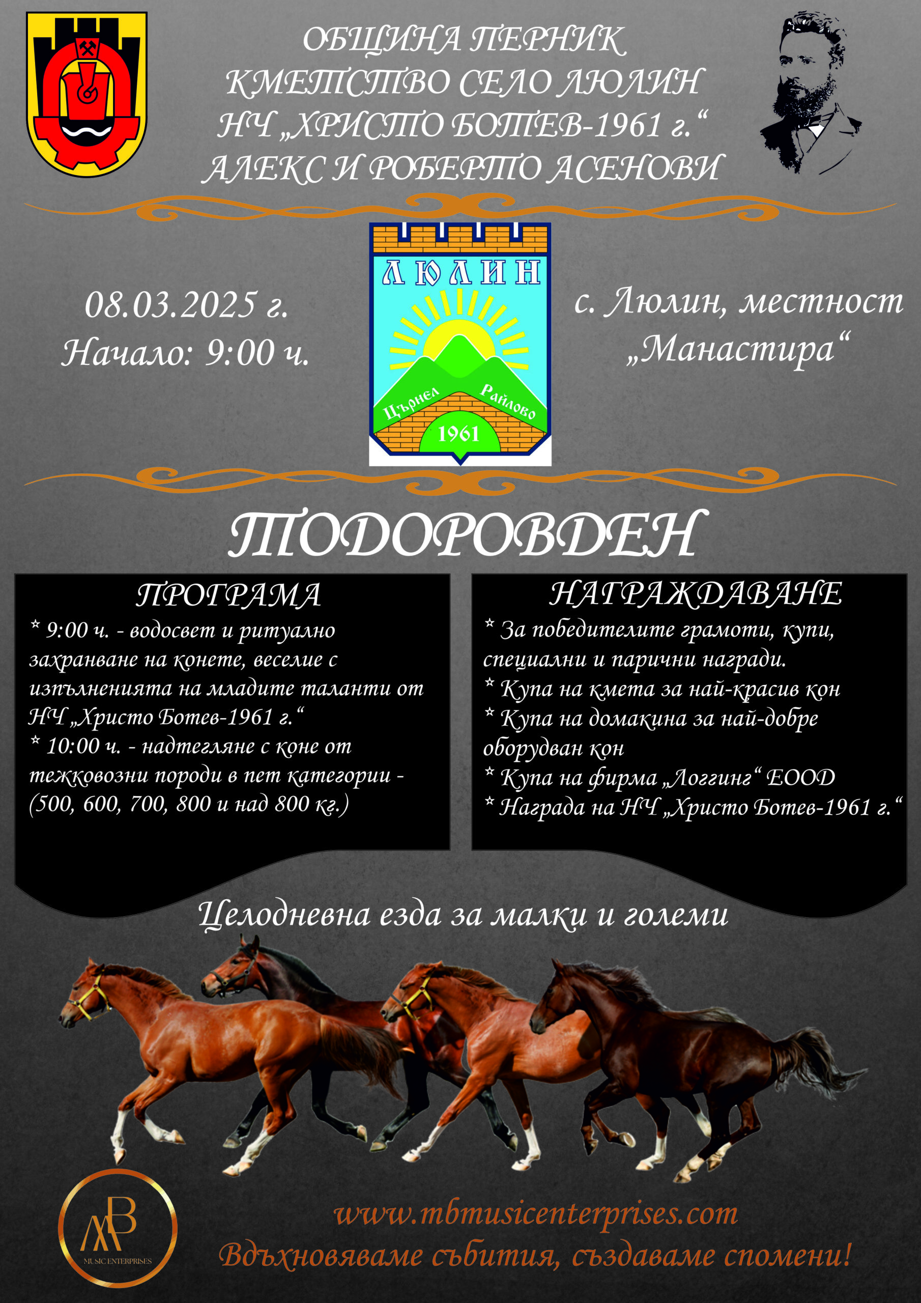 На 08.03.2025 г. от 09:00 ч. в местността „Манастира“ в пернишкото село Люлин ще бъде отбелязан празникът Тодоровден. За четвърта поредна година домакин на събитието е Николай Асенов и неговата фамилия.