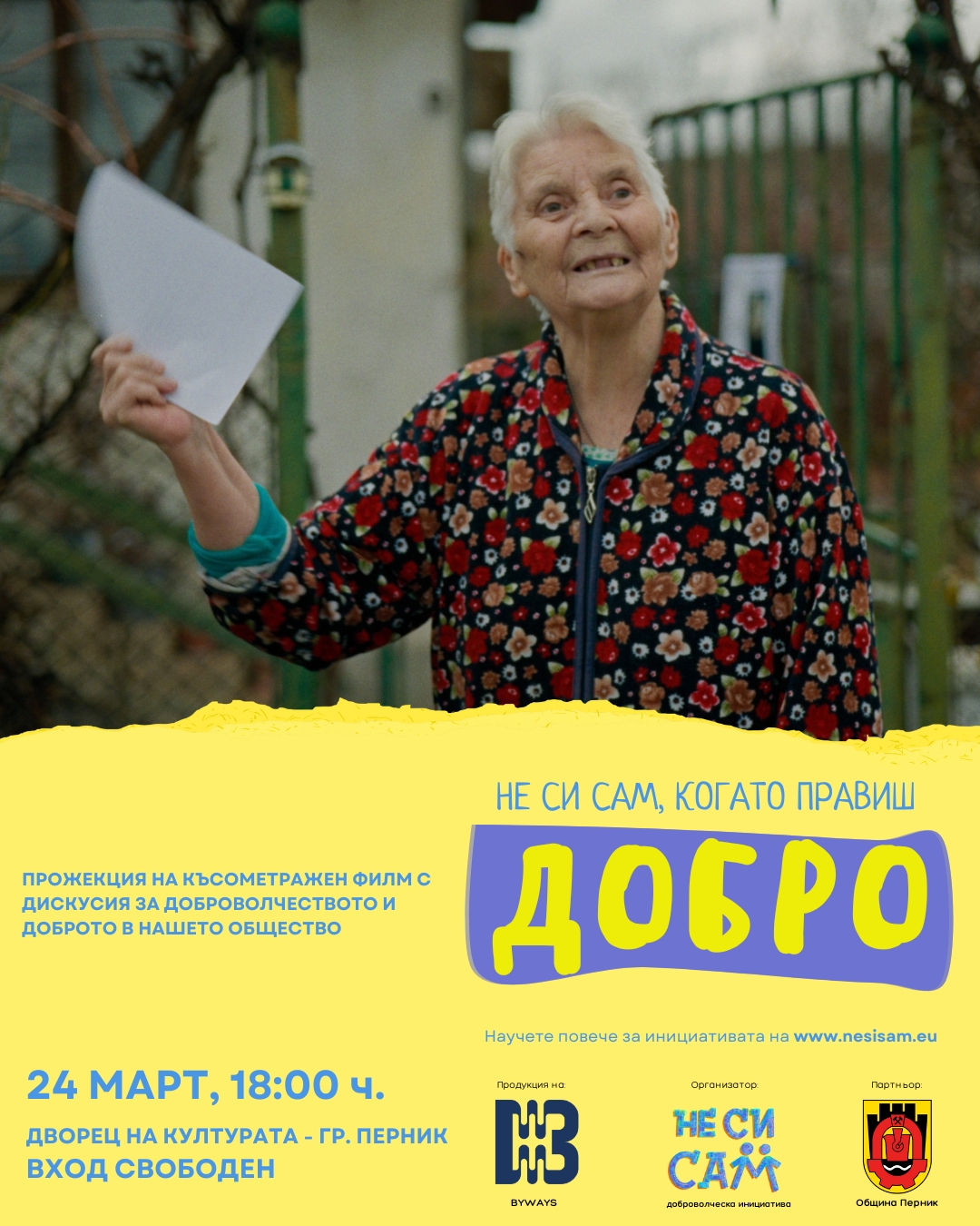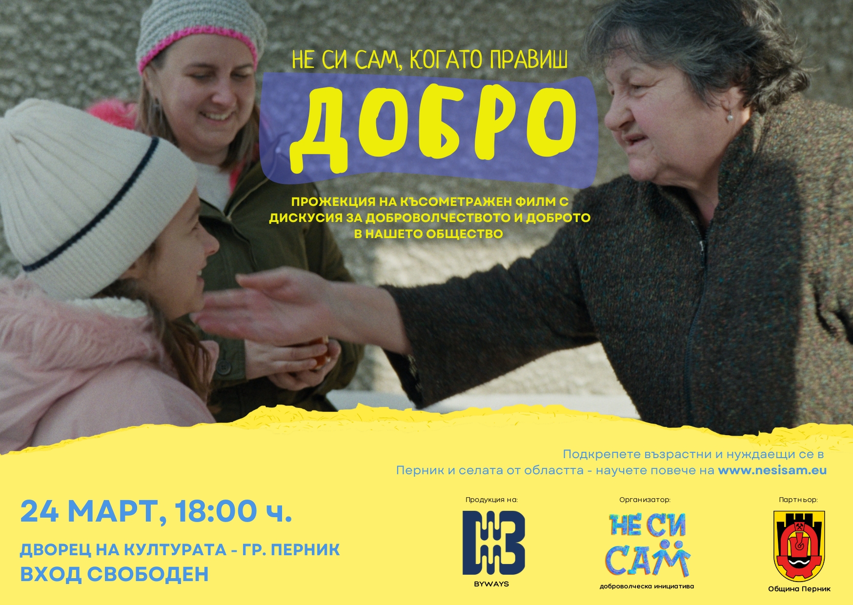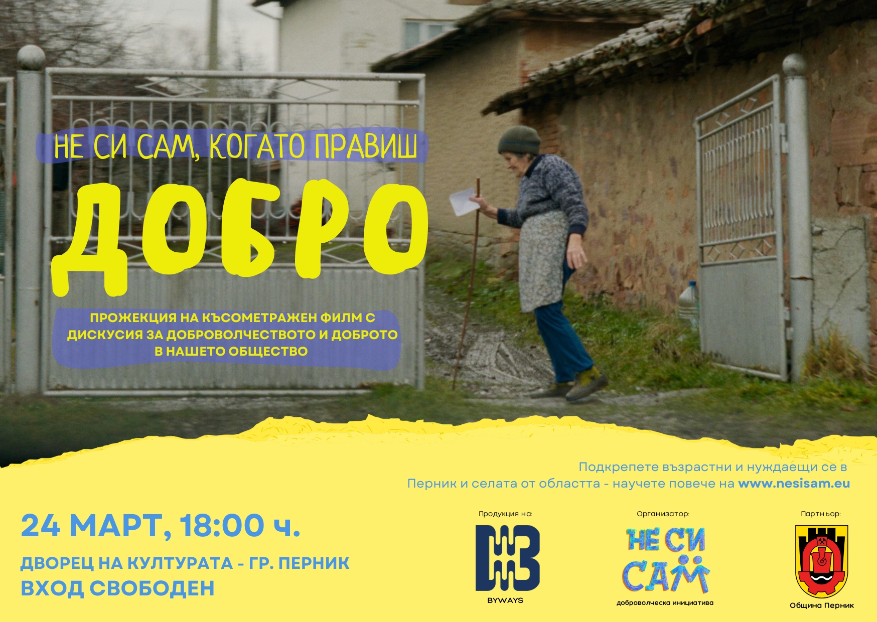 Представянето на филма бележи началото на Великденската кампания на „Не си сам“ за раздаване на хранителни продукти в град Перник и селата от областта, която ще се състои в седмиците преди големия християнски празник. Организаторите си поставят за цел да достигнат до над 750 нуждаещи се, а инициативата разширява обхвата си за поред тип в областта като включва и селата край Брезник и Ковачевци. Традиционно ще бъдат подкрепени и възрастни хора в нужда от над 30 населени места в общините Перник, Радомир и Трън.