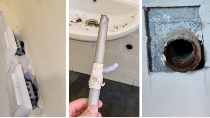 В санитарните помещения на стаите мивките не са свързани с канализацията. Отделно в някои от тях, свързването на уплътненията на мивките с канализацията е е направено с дръжки на мопове за почистване.