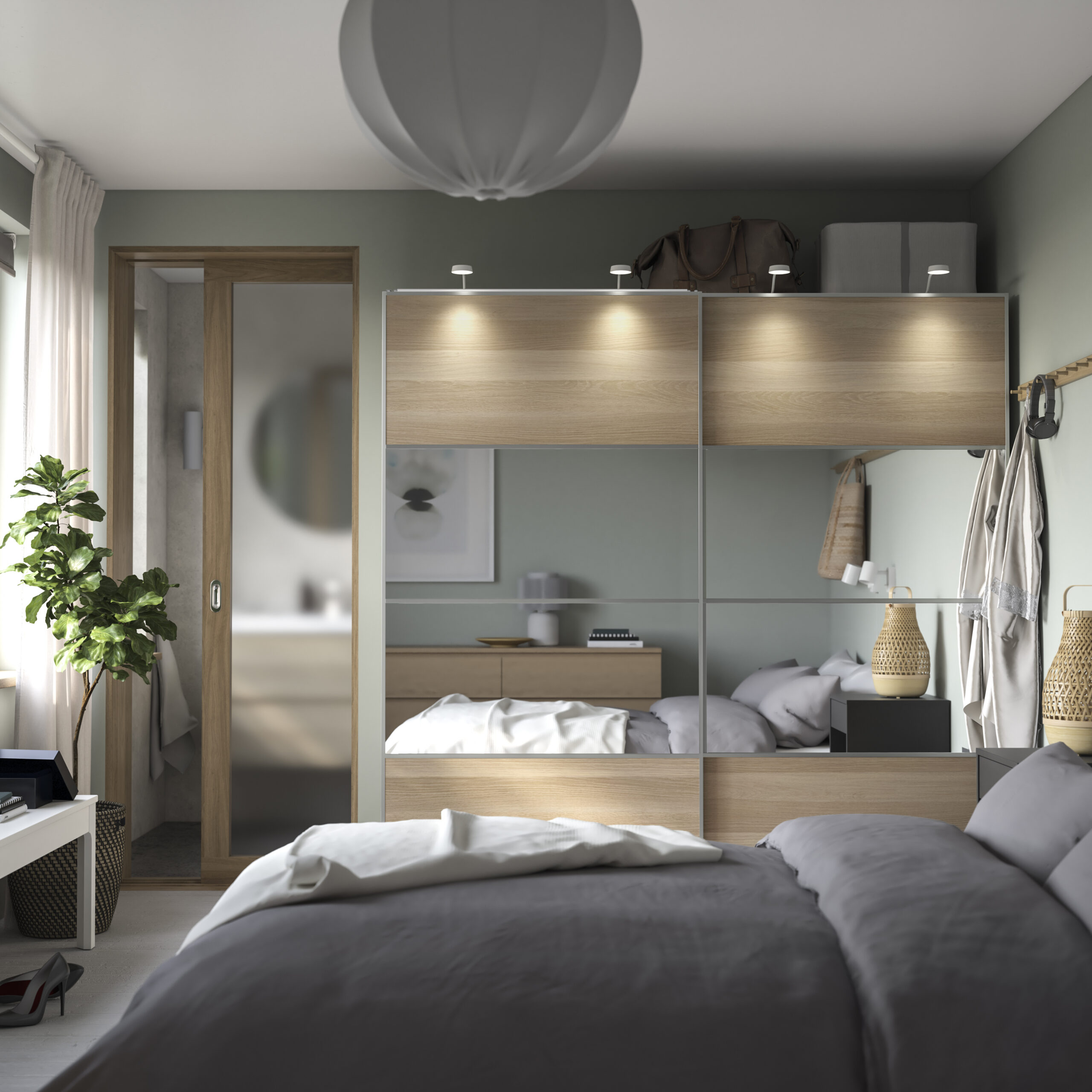 Когато говорим за по-големи спални или вградени гардероби, РАХ дава възможност за изграждане на голяма конструкция с място за закачалки за дрехите, които не искате да мачкате, и рафтове за онези, които предпочитате да приберете сгънати. Можете да комбинирате различни ширини и височини, да изберете врати от избелен дъб за по-топло усещане или такива с по-модерен вид. Независимо дали търсите минималистичен уют или модерен съвременен стил – винаги има PAX система, която да пасне на визията ви.