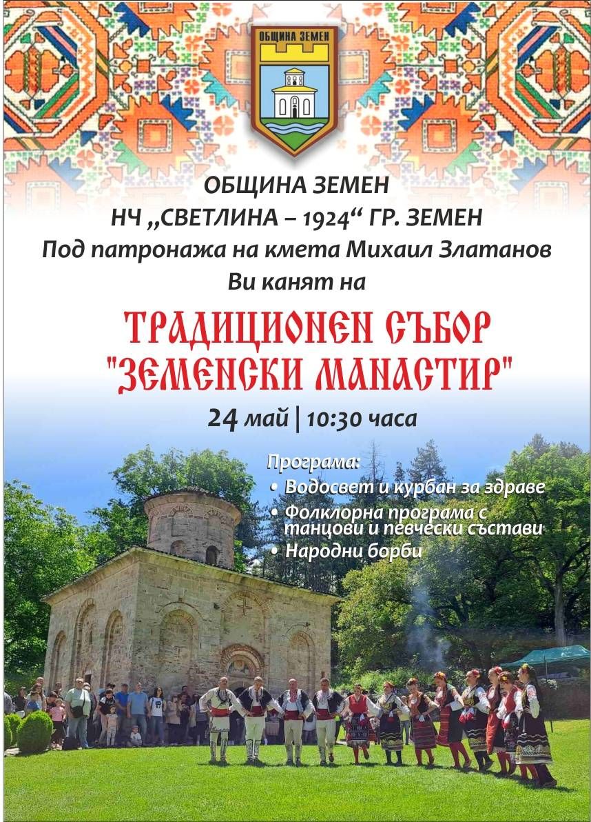 На 24 май 2025 г. благословеният двор на Земенския манастир „Св. Йоан Богослов“ ще се превърне в арена на родолюбие, сила и фолклор. Община Земен организира Традиционния събор – земляческа среща, а програмата както винаги е богата и атрактивна.