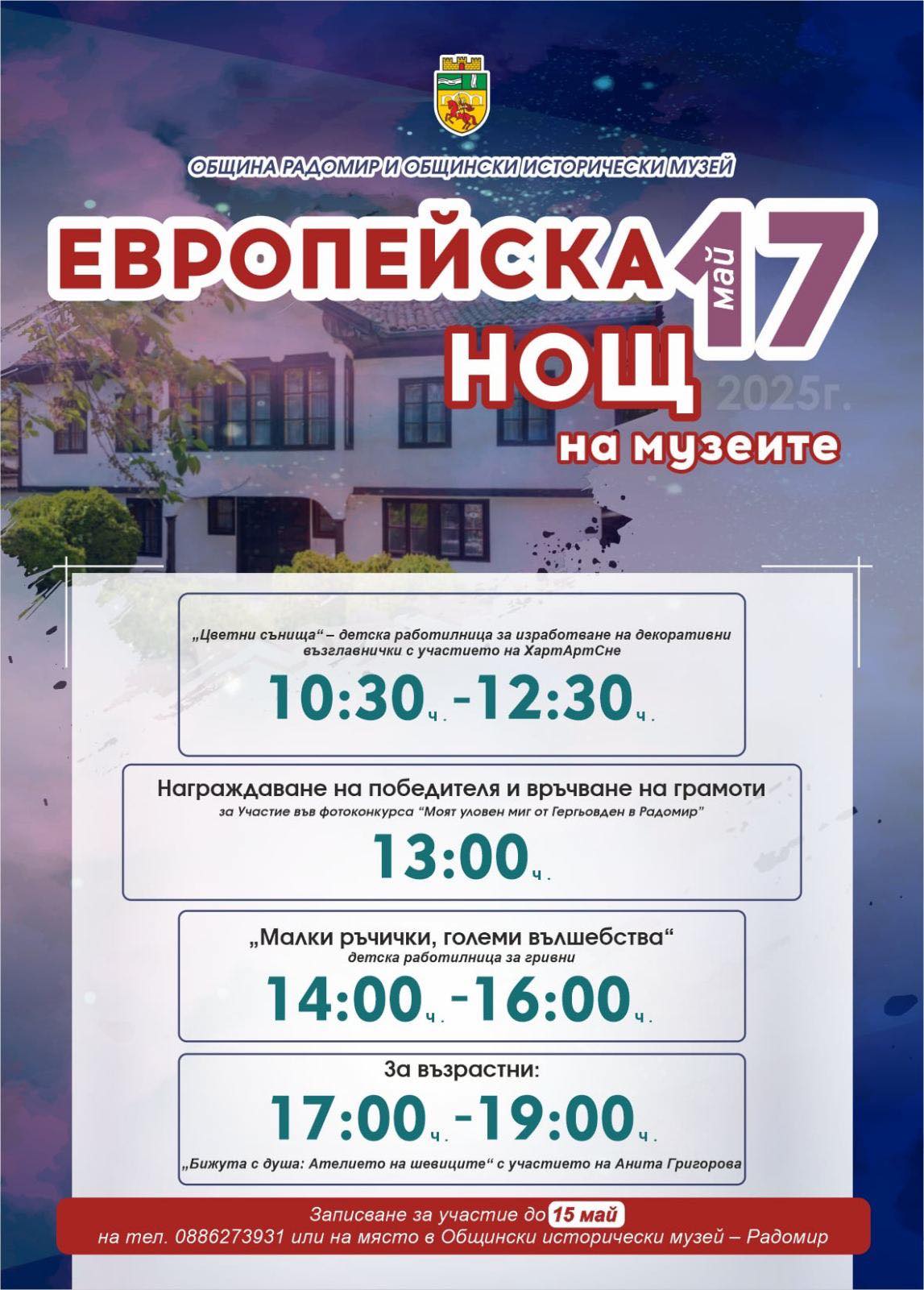 Записването е до 15 май на тел. 0886 273 931 или на място в Общинския исторически музей – Радомир.