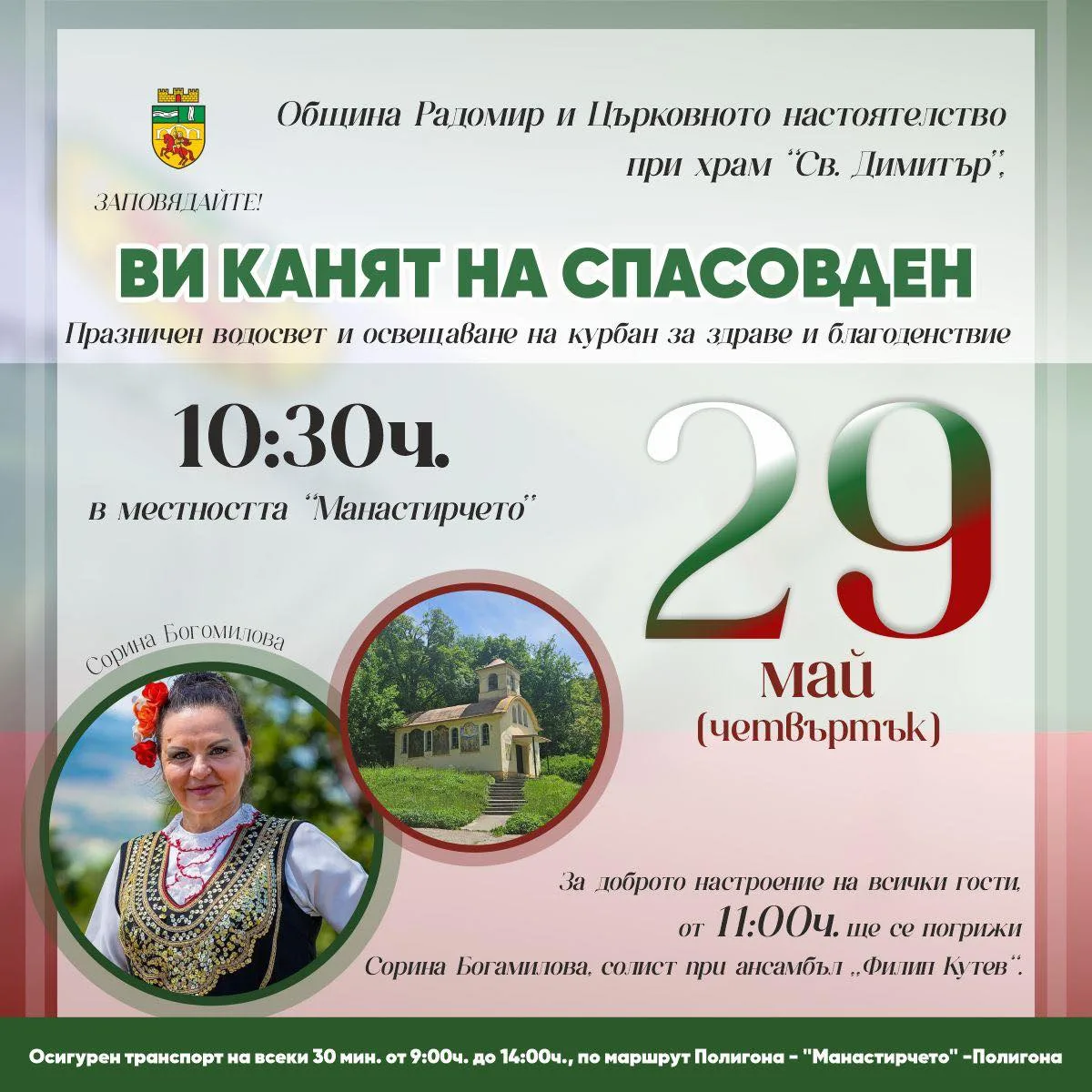 Голямо тържество готви Община Радомир по случай Възнесение Господне (Спасовден)! На 29 май (четвъртък) всички жители са поканени на свято място – местността „Манастирчето“, където ще има празничен водосвет и курбан за здраве и благоденствие