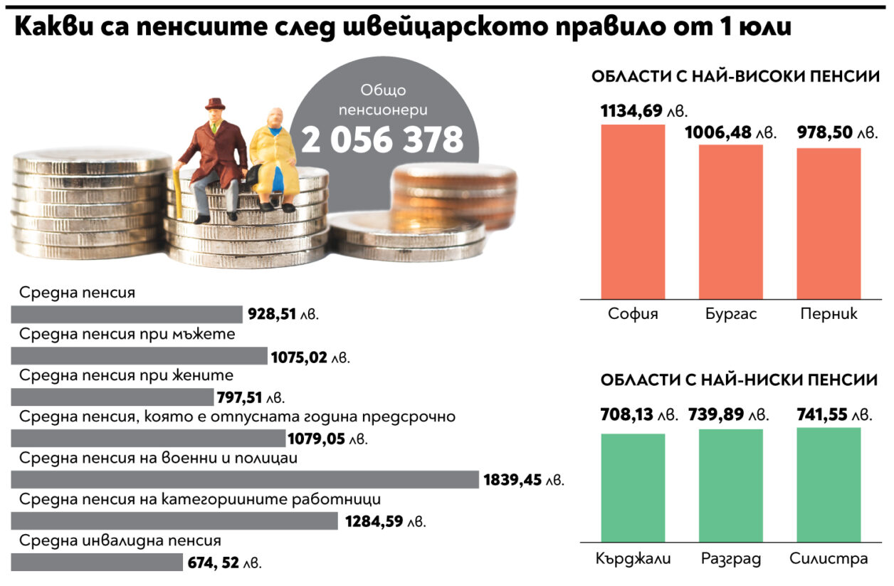 Най-богатите пенсионери отново живеят в София, като средният размер през юли вече е 1134,69 лв. В Бургас получават с почти 130 лв. по-малко, а в Перник минават с малко 500-те евро. (Виж инфографиката.)