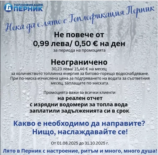 Перник влиза в лятото с най-щедрата оферта на „Топлофикация Перник“ – неограничена топла вода срещу не повече от 0,99 лв на ден (0,50 евро)!