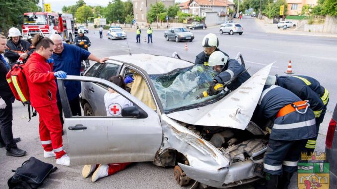 Днес в централната част на Радомир се проведе симулация на пътнотранспортно произшествие (ПТП), която постави акцент върху важността на реакцията при подобни инциденти. Мероприятието е част от съвместно регионално учение, демонстрира ситуация на катастрофа между два автомобила с пострадали, предизвикана от дете, управляващо тротинетка, което по невнимание е излязло на платното за движение.