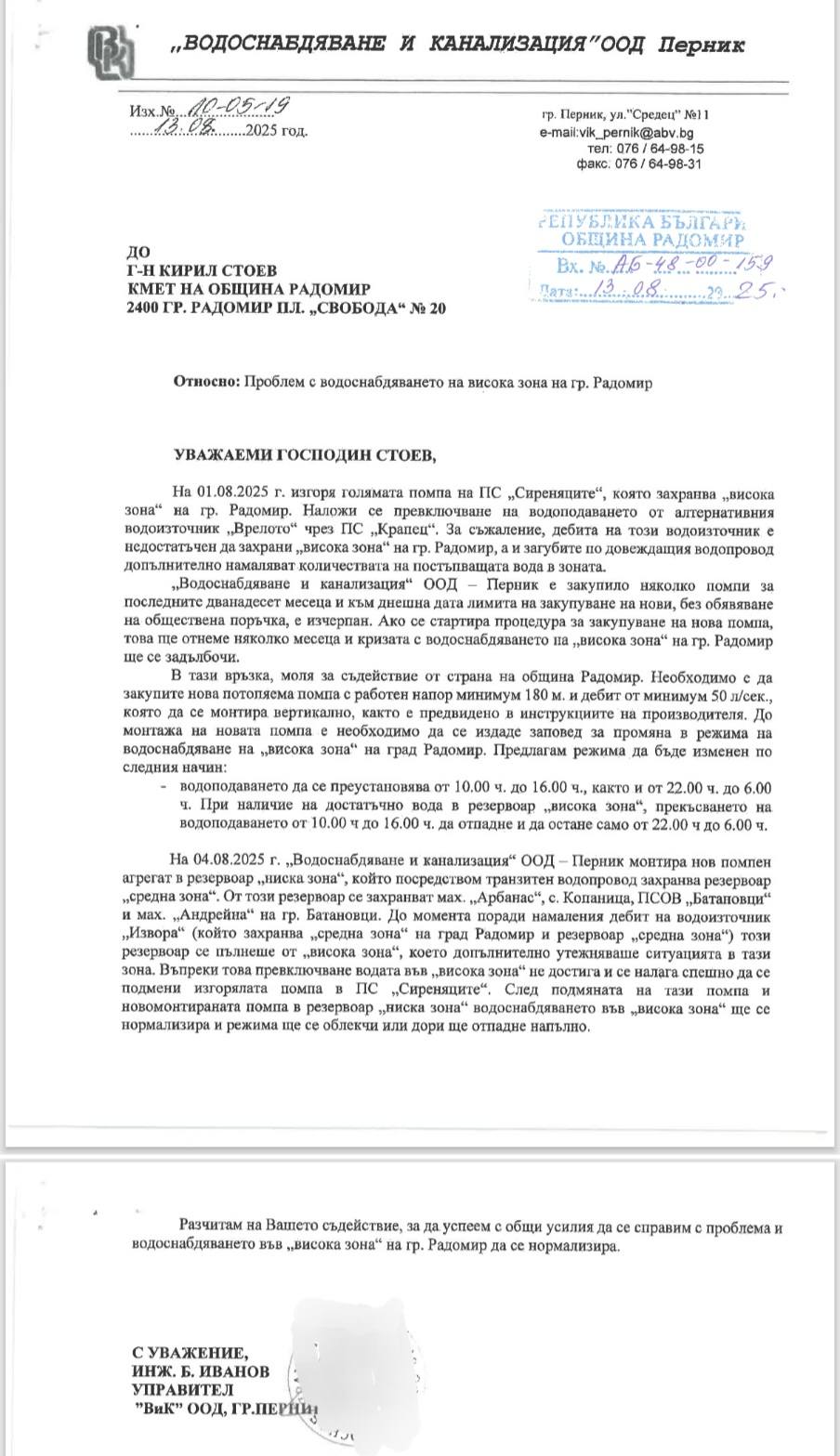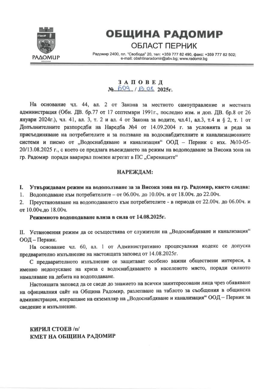 От 14 август 2025 г. се въвежда режим на водоподаване за Висока зона на гр. Радомир поради авария на помпен агрегат в ПС „Сиреняците“.