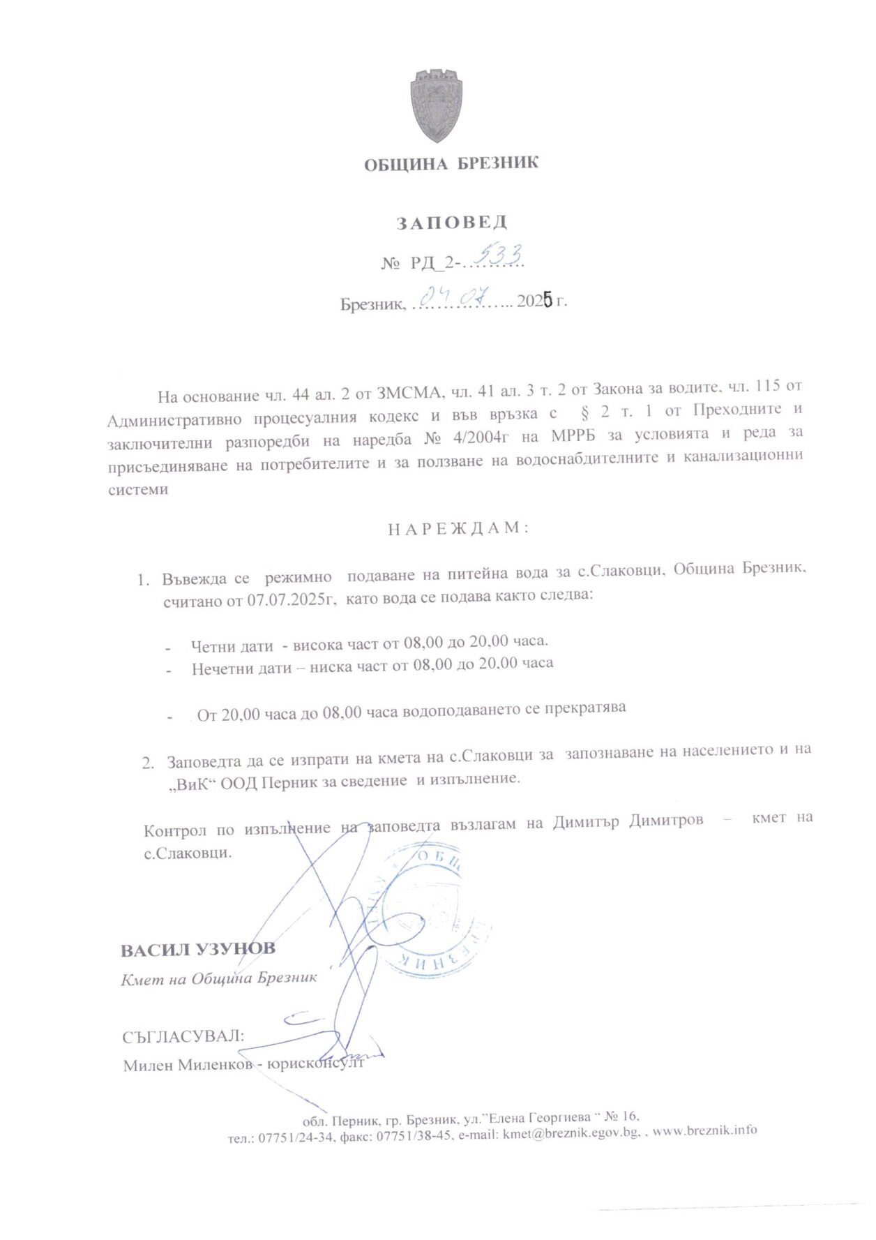 От 7 юли 2025 г. в село Слаковци, община Брезник, се въвежда режимно подаване на питейна вода. Това става ясно от заповед на кмета на община Брезник Васил Узунов.