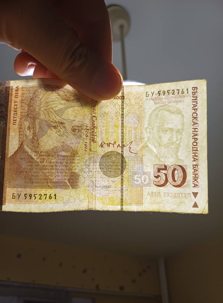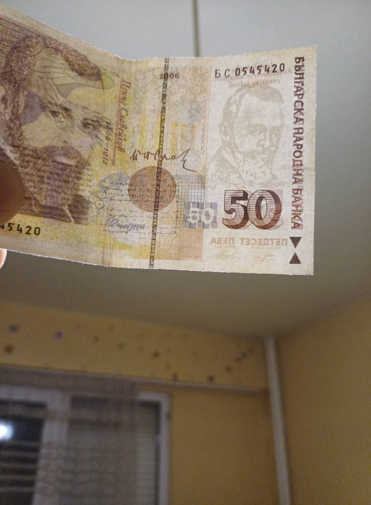 „В града ни са плъзнали фалшиви петдесетолевки, които явно на УВ лампа изглеждат ОК. Хартията им е странна на пипане, а ще приложа снимки на фалшивата, която ми върнаха в каса на изпей. Преди малко видях, че фалшиви петдесетолевки са били засечени и в офис на куриерска фирма. Фалшивата банкнота е на втората снимка.“
