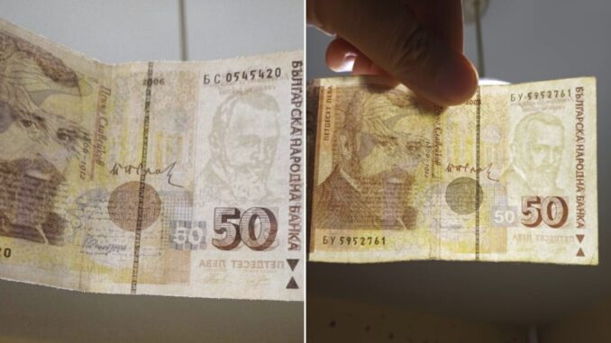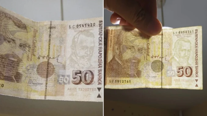 „В града ни са плъзнали фалшиви петдесетолевки, които явно на УВ лампа изглеждат ОК. Хартията им е странна на пипане, а ще приложа снимки на фалшивата, която ми върнаха в каса на изпей. Преди малко видях, че фалшиви петдесетолевки са били засечени и в офис на куриерска фирма. Фалшивата банкнота е на втората снимка.“