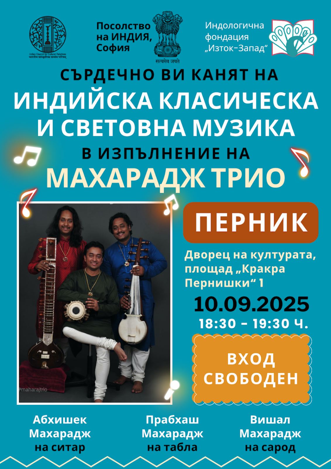 Утре, 10 септември, от 18:30 ч. в малкия салон на Двореца на културата ще се състои концерт на световноизвестното индийско трио „Махарадж“. Входът за събитието е свободен.