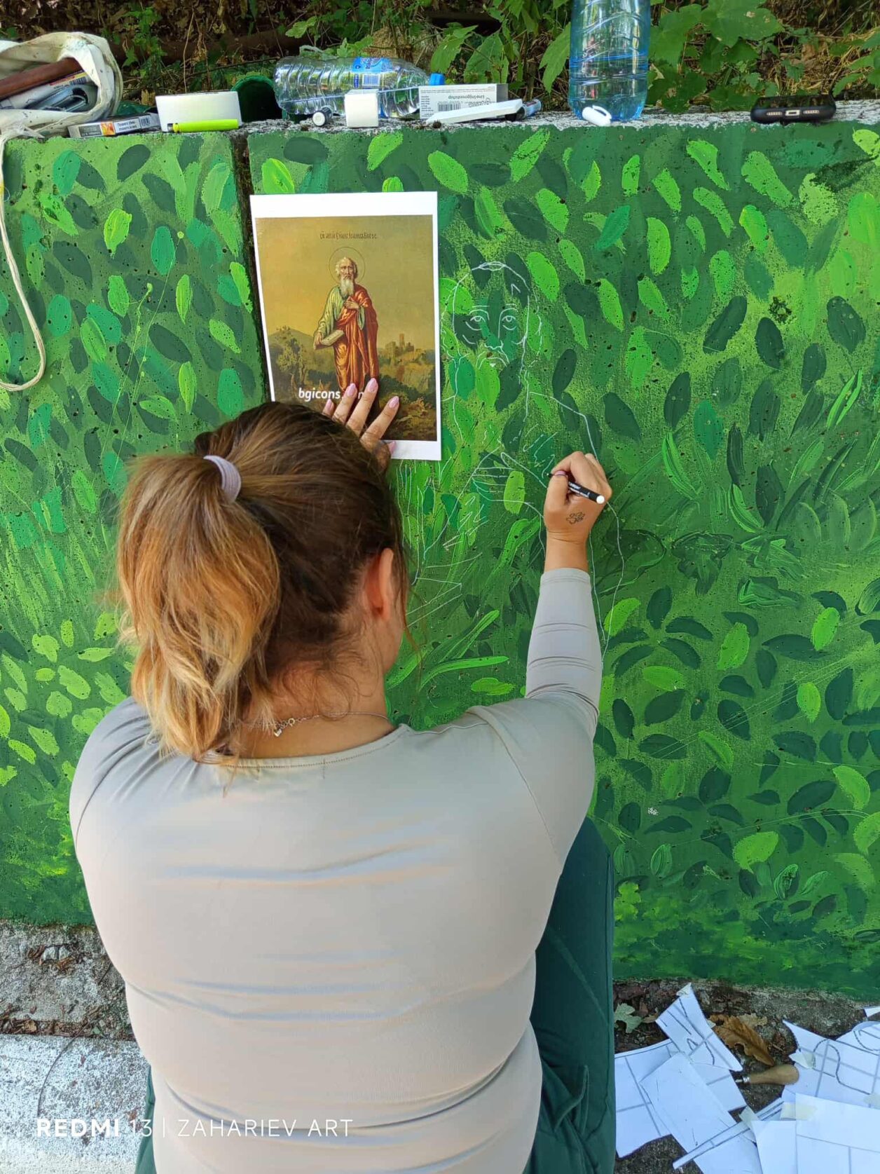 Основен акцент в проекта е образът на Св. Йоан Богослов – покровител на Земенския манастир, който вече е изрисуван върху една от стените. Организаторите очакват разрешение да добавят още 11 светци – покровители на църкви и манастири, изобразени на входа на града.