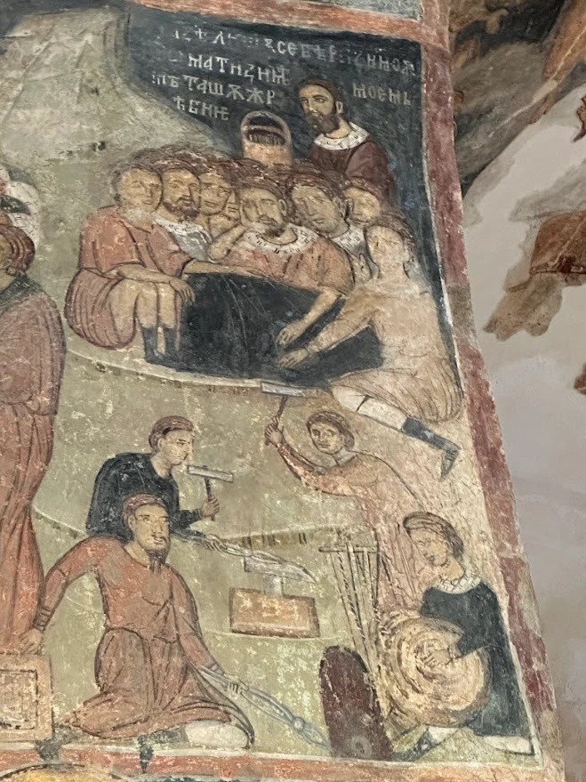 Другото бижу е сцената „Изковаването на пироните за Разпятието“ – толкова детайлна и драматична, че сякаш извежда зрителя извън религиозния канон и го хвърля в суровата реалност на мъчителното дело. Това е една от малкото подобни композиции в православната живопис, оцелели до днес.