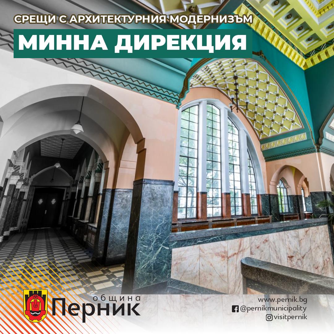 Минната дирекция е построена през 1932 г. по проект на архитектите Коста Николов и Илия Попов. Сградата впечатлява със своя пищен еклектизъм, съчетаващ елементи на ар деко, неоготика, неоренесанс и националромантизъм – символ на епохата на разцвет на пернишките мини, движеща сила за целия регион.