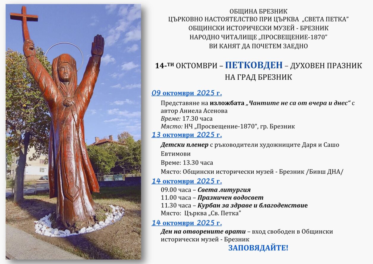 Брезник подготгвя духовния празник на града – Петковден.  От 9 до 14 октомври общината, църквата „Св. Петка“ и читалище „Просвещение-1870“ ще посрещнат жители и гости с богата програма, посветена на покровителката на града.