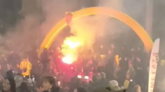 Навсякъде — дървени бараки, газови бутилки, дим от кебапчета и пейки с бира по масите. И точно тогава, насред тълпата, фенове от агитката на „Миньор“ решиха да внесат „малко емоция“ — извадиха факли и започнаха да ги въртят над главите на хората!