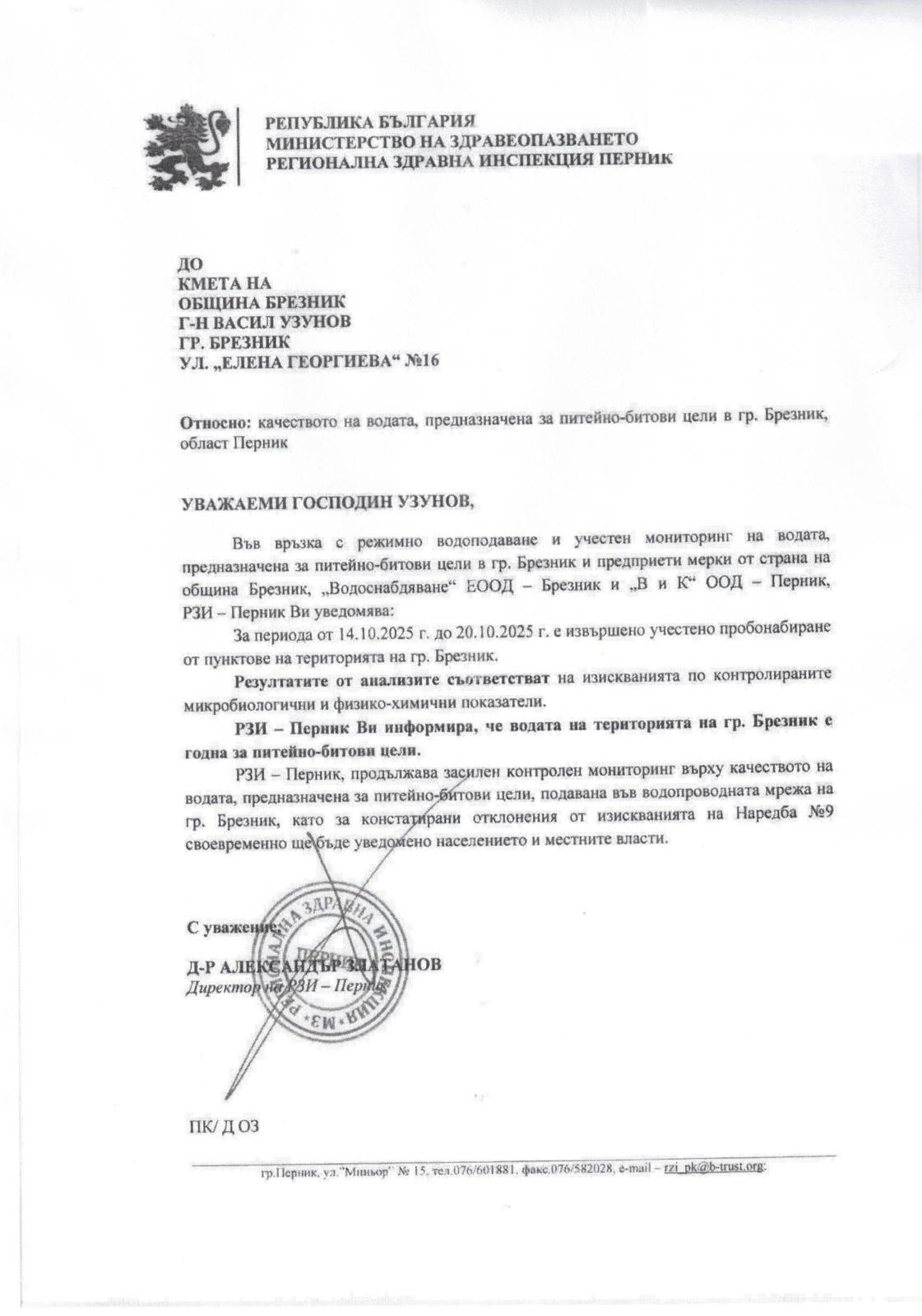 В периода от 14 до 20 октомври 2025 г. са извършени лабораторни изследвания на проби от различни пунктове в Брезник. Резултатите доказват, че по всички микробиологични и физико-химични показатели водата е безопасна за консумация.