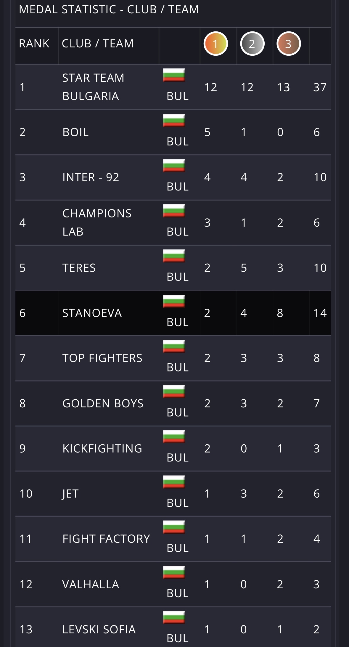 Крайното класиране за отбора е: 2 златни медала 4 сребърни медала 8 бронзови медала