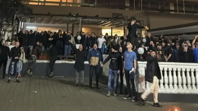 Феновете на „Левски“ излязоха пред хотела и взривиха мощна заря, на която пееха с мощно гърло „Ние сме Левски София“.