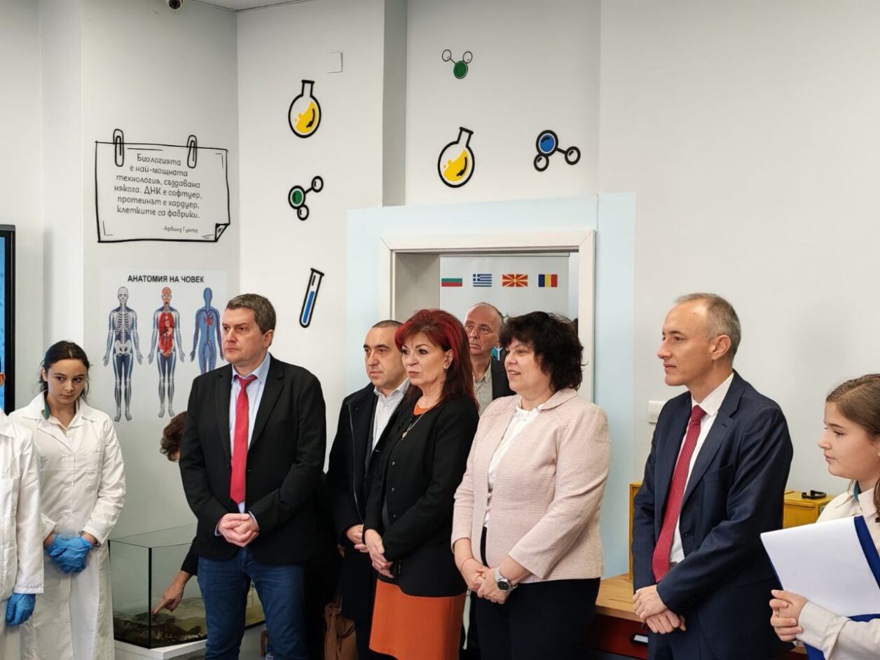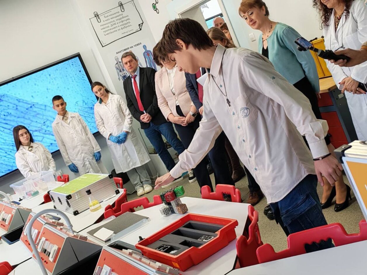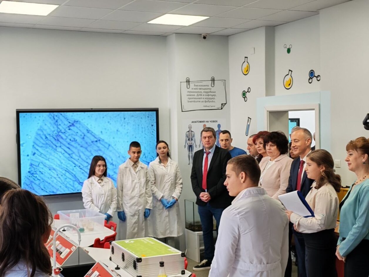 Ученици демонстрираха възможностите на новия кабинет и правиха лабораторни опити пред министъра. Програмата включваше и демонстрация на сурвакари.
