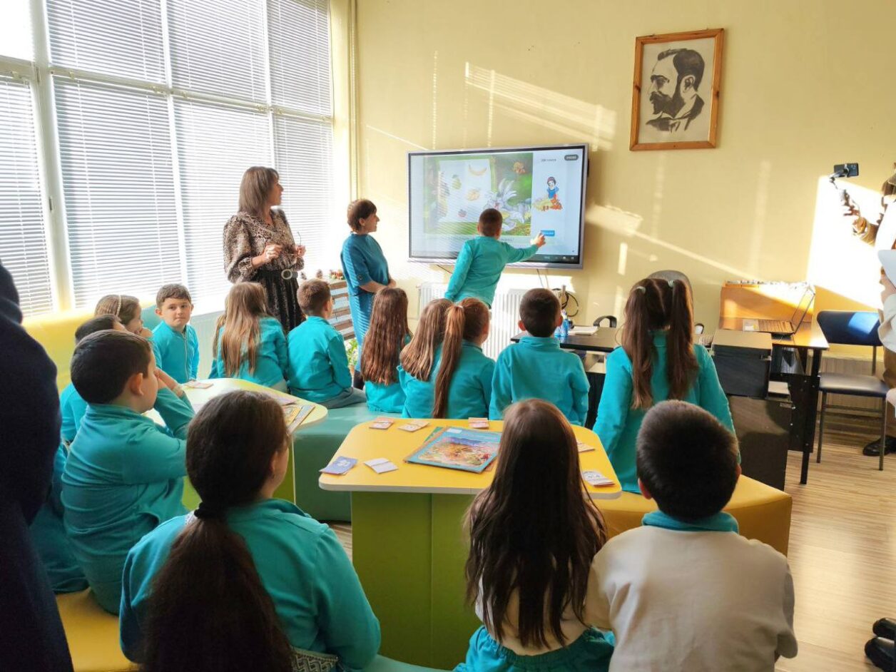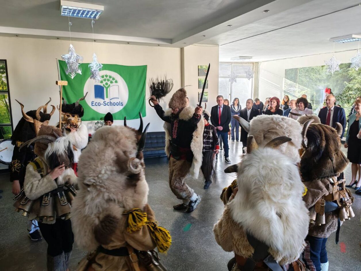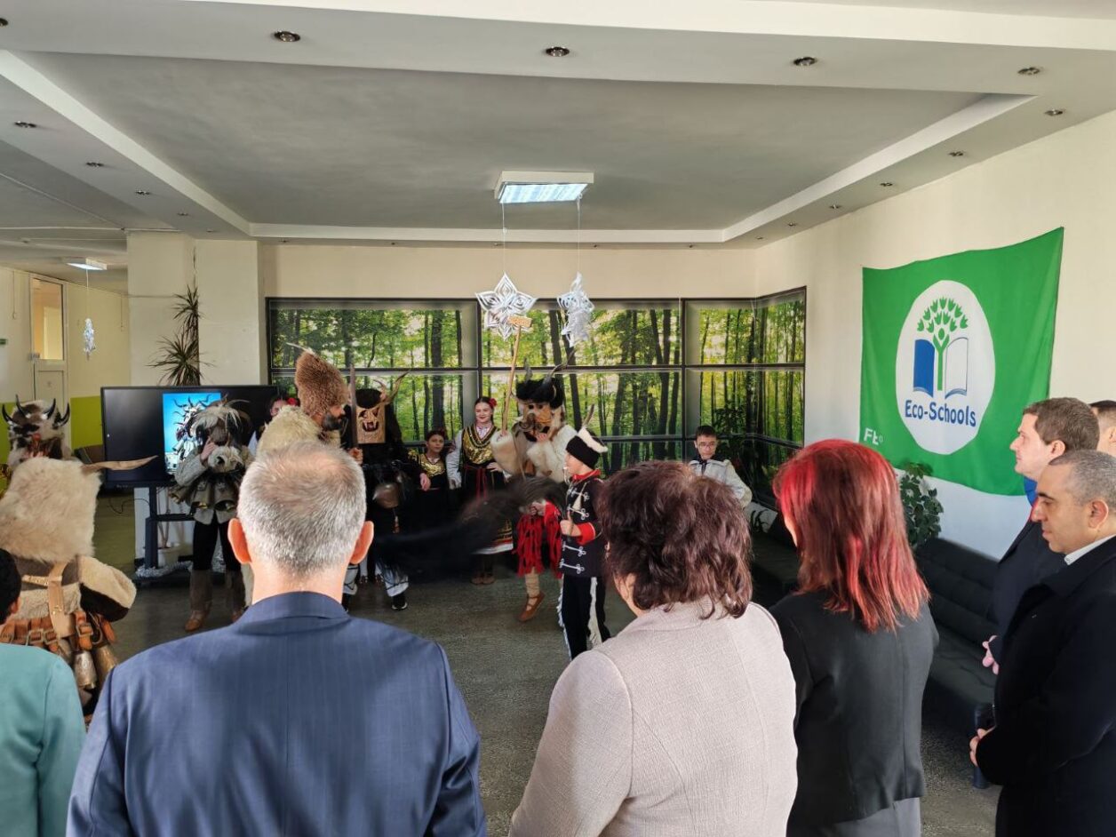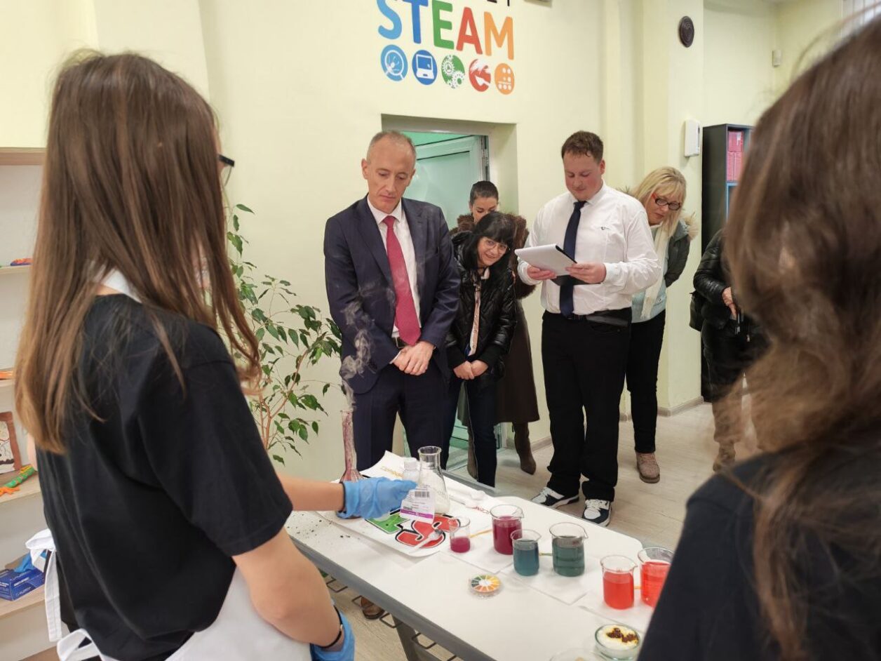 Ученици демонстрираха възможностите на новия кабинет и правиха лабораторни опити пред министъра. Програмата включваше и демонстрация на сурвакари.