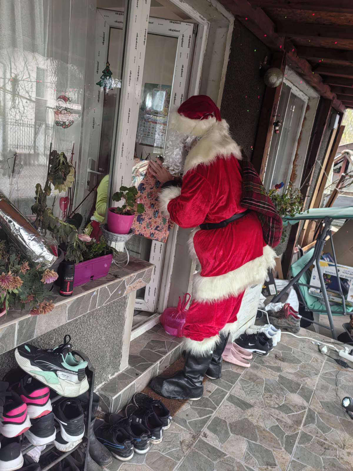 Дядо Коледа, нарамил голям чувал  на гръб обикаляше къща след къща и тропаше по домовете, но не както коледар, а да раздава подаръци.