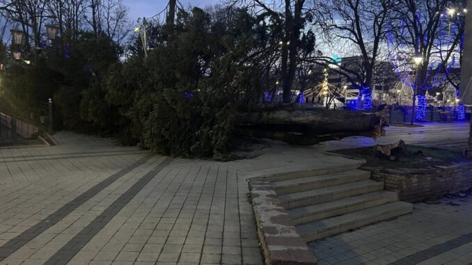 Огромно дърво се пречупи в центъра на Перник от силния вятър.