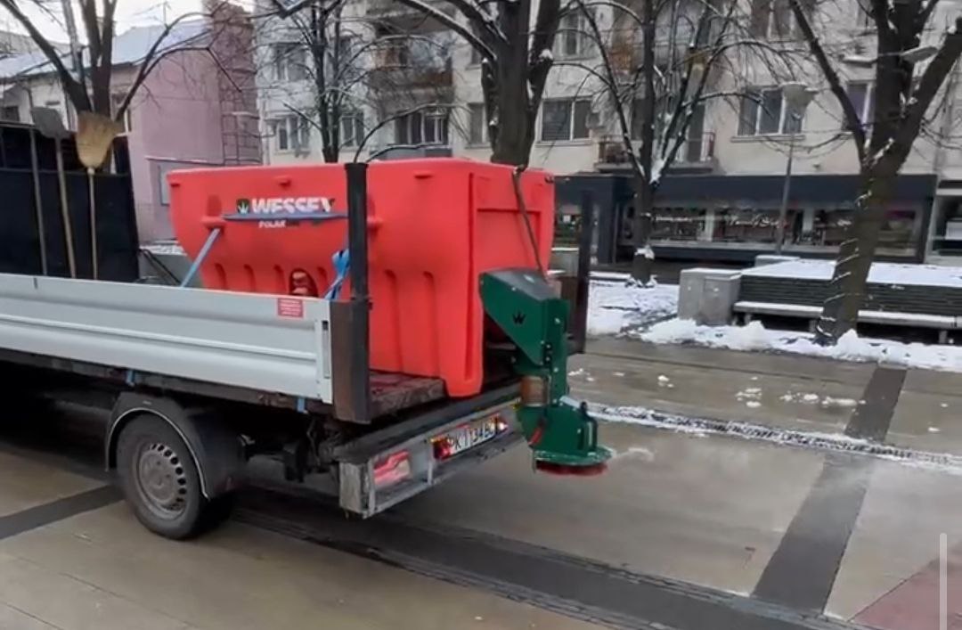Днес машини на общинското предприятие „Флор“ са третирали площада със специална смес, против заледяване.