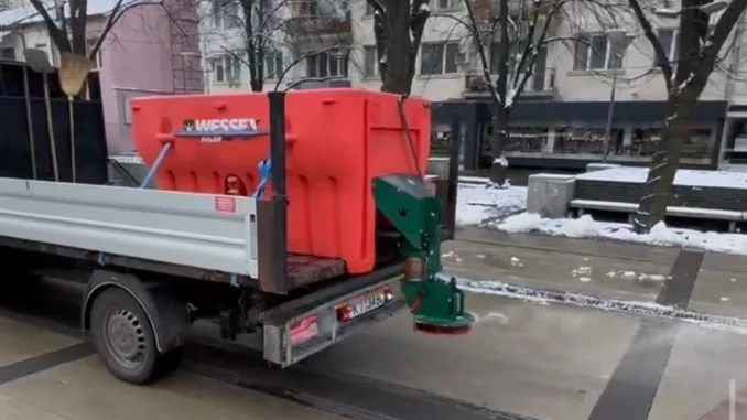 Днес машини на общинското предприятие „Флор“ са третирали площада със специална смес, против заледяване.