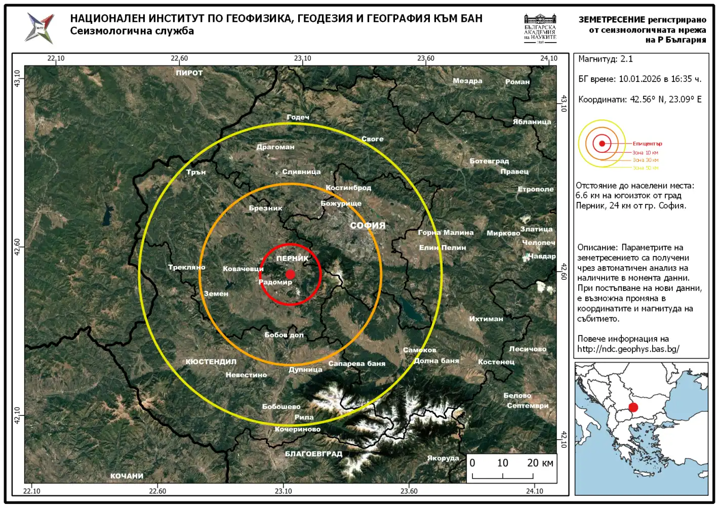 Трусът е станал в 16:35 часа днес, а епицентърът му е само на 6,6 километра от Перник и на 24 от София.