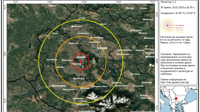 Трусът е станал в 16:35 часа днес, а епицентърът му е само на 6,6 километра от Перник и на 24 от София.